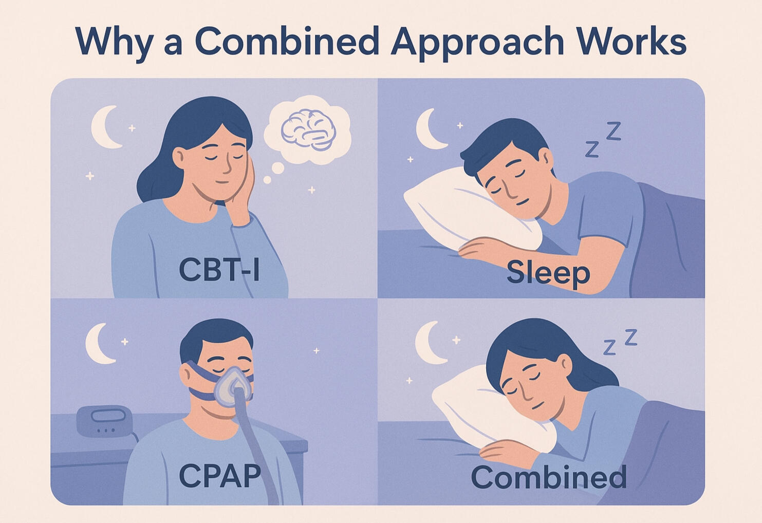 CBT-I targets the root cause of insomnia, helping to quiet anxious thoughts and address behaviors that make sleep difficult. Meanwhile, CPAP physically resolves the breathing issues caused by sleep apnea. This dual-approach leads to better sleep quality and makes it easier to tolerate and benefit from CPAP, since the underlying insomnia is no longer a barrier.